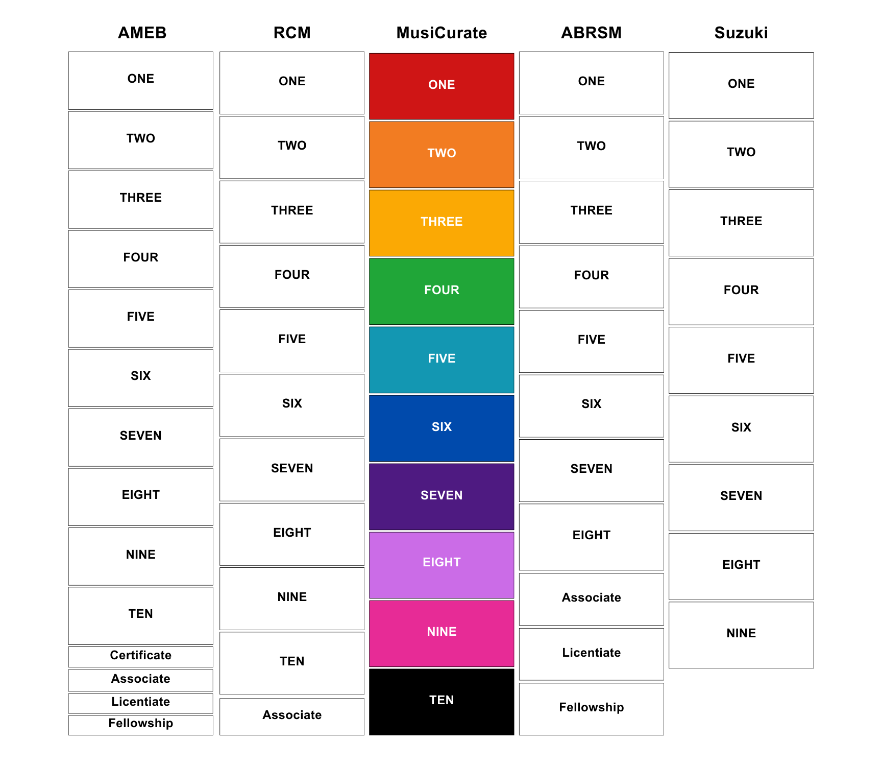 See the chart below for approximate equivalencies to use MusiCurate as a supplemental resource in your graded examinations.
