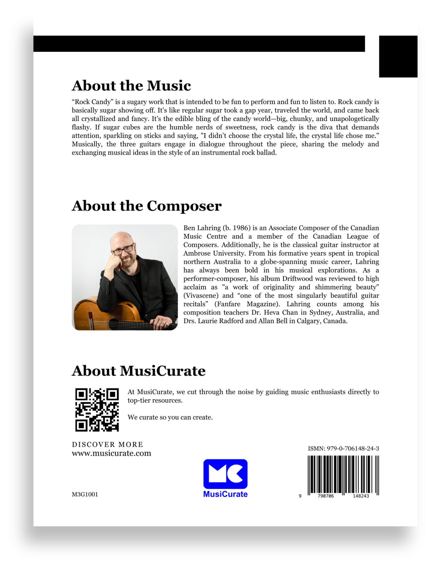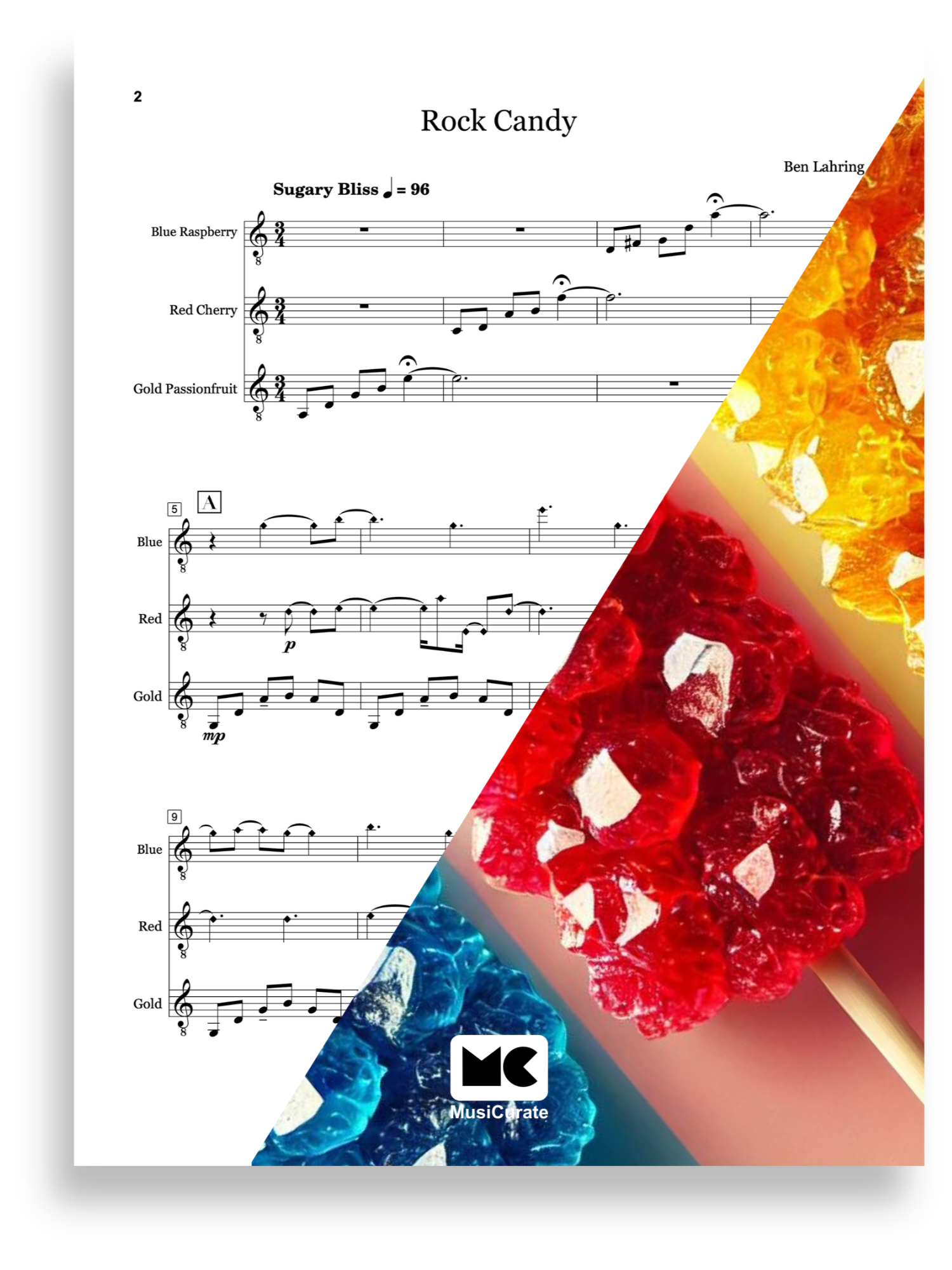 “Rock Candy” is a sugary work that is intended to be fun to perform and fun to listen to. Rock candy is basically sugar showing off. It's like regular sugar took a gap year, traveled the world, and came back all crystallized and fancy. It's the edible bling of the candy world—big, chunky, and unapologetically flashy. If sugar cubes are the humble nerds of sweetness, rock candy is the diva that demands attention, sparkling on sticks and saying, "I didn’t choose the crystal life, the crystal life chose me." Musically, the three guitars engage in dialogue throughout the piece, sharing the melody and exchanging musical ideas in the style of an instrumental rock ballad.