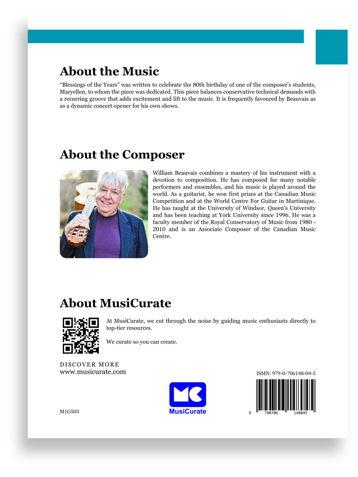 William Beauvais combines a mastery of his instrument with a devotion to composition. He has composed for many notable performers and ensembles, and his music is played around the world. As a guitarist, he won first prizes at the Canadian Music Competition and at the World Centre For Guitar in Martinique. He has taught at the University of Windsor, Queen's University and has been teaching at York University since 1996. He was a faculty member of the Royal Conservatory of Music from 1980 - 2010 and is an Associate Composer of the Canadian Music Centre.