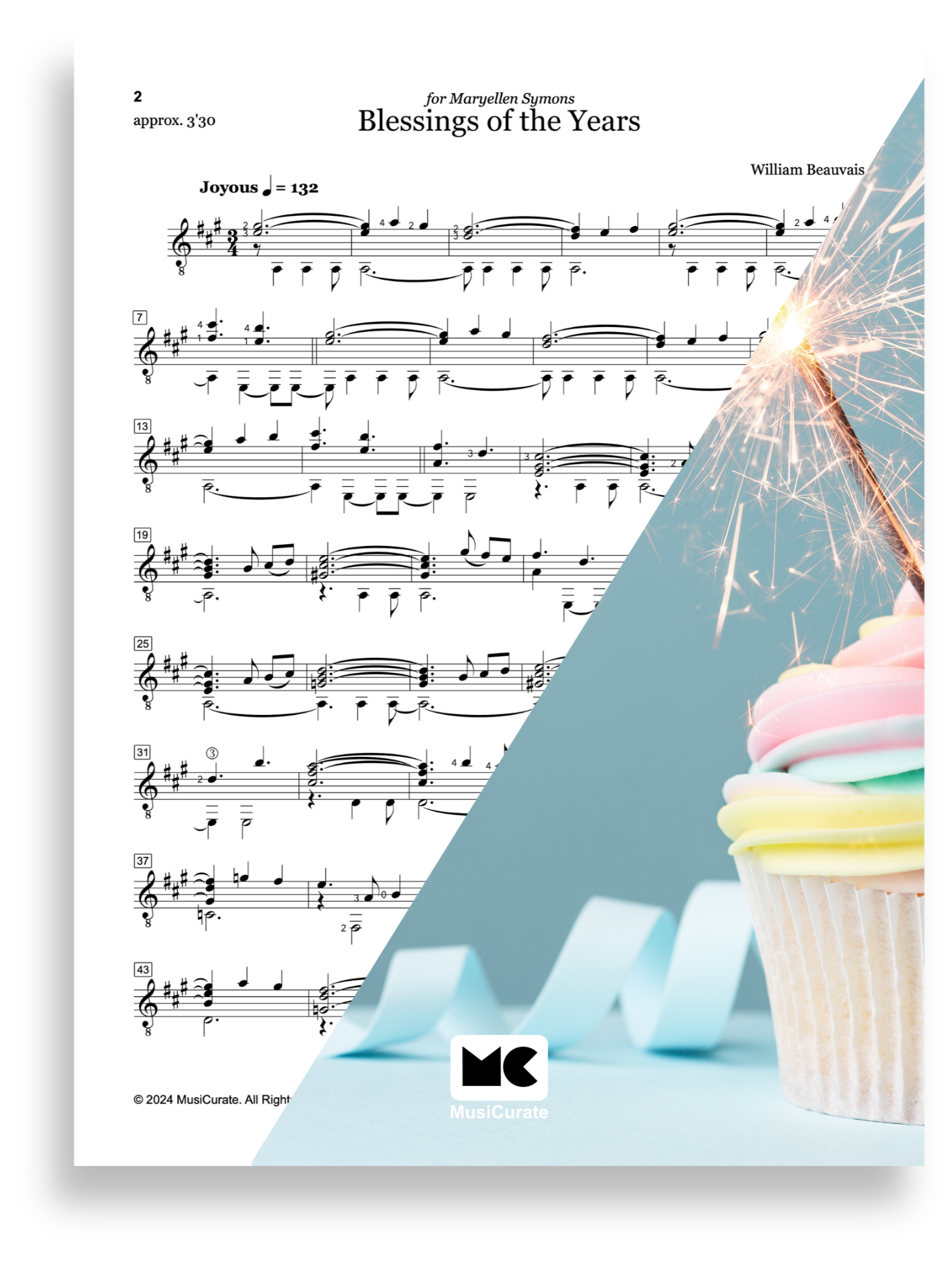 "Blessings for the Years" was written to celebrate the 80th birthday of one of the composer’s students, Maryellen, to whom the piece was dedicated. This piece balances conservative technical demands with a recurring groove that adds excitement and lift to the music. It is frequently favoured by Beauvais as as a dynamic concert opener for his own shows.