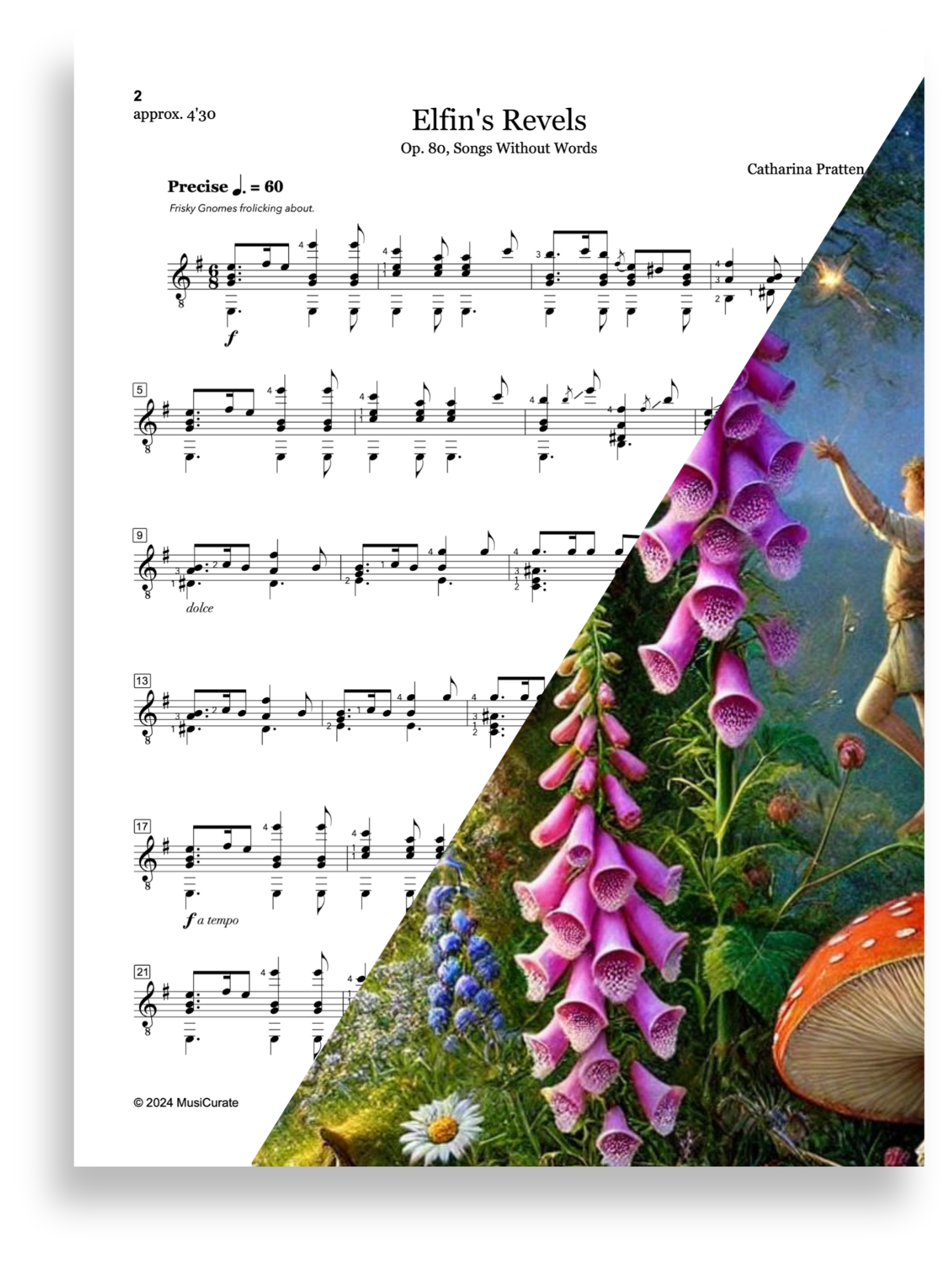 Catharina Josepha Pratten (1824 - 1895), also known as Madame Sidney Pratten, was a distinguished German guitarist, composer, and teacher who spent most of her career in England. She was born to guitarist Ferdinand Pelzer and began touring Europe at a young age. Pratten married flautist Robert Sidney Pratten in 1854 and established a successful guitar school in London. She composed approximately 250 works and published influential guitar instruction books. Pratten regularly gave concerts at Steinway Hall and the residences of notable patrons like the Duchess of Newcastle. Princess Louise, whose mother was Queen Victoria, was a devoted pupil and patron of Madame Pratten and frequently attended her concerts. Pratten performed many of her own compositions at these concerts, among which Elfin’s Revels was an audience favourite. It may have been inspired by The Elfin Revel, a poem by fellow Londoner John George Watts.