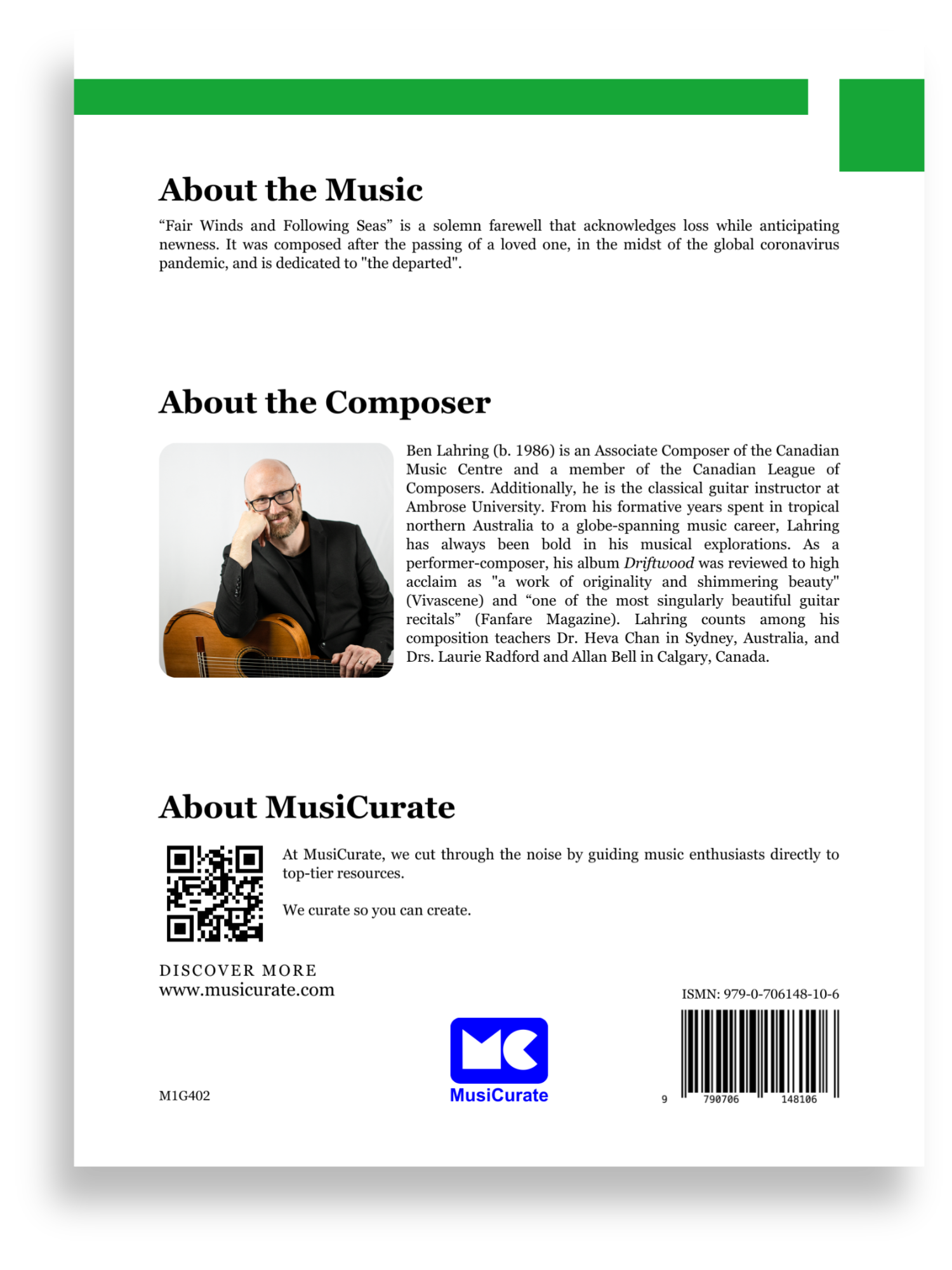 Ben Lahring (b. 1986) is an Associate Composer of the Canadian Music Centre and a member of the Canadian League of Composers. Additionally, he is the classical guitar instructor at Ambrose University. From his formative years spent in tropical northern Australia to a globe-spanning music career, Lahring has always been bold in his musical explorations. As a performer-composer, his album Driftwood was reviewed to high acclaim as "a work of originality and shimmering beauty" (Vivascene) and “one of the most singularly beautiful guitar recitals” (Fanfare Magazine). Lahring counts among his composition teachers Dr. Heva Chan in Sydney, Australia, and Drs. Laurie Radford and Allan Bell in Calgary, Canada.
