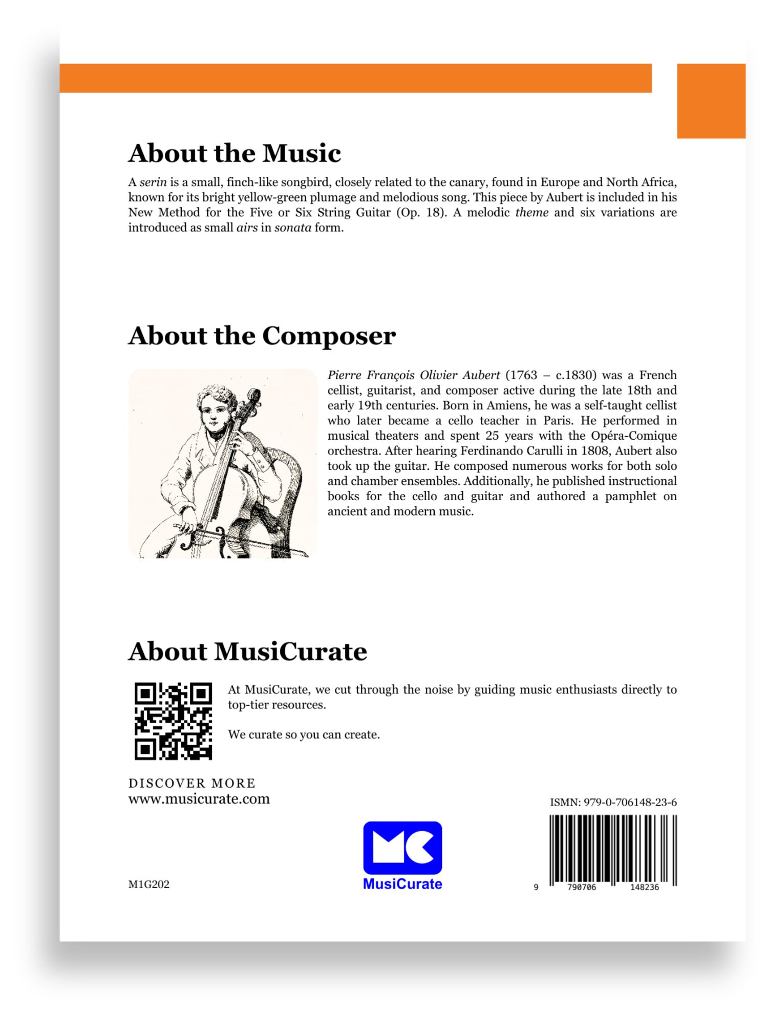 A serin is a small, finch-like songbird, closely related to the canary, found in Europe and North Africa, known for its bright yellow-green plumage and melodious song. This piece by Aubert is included in his New Method for the Five or Six String Guitar (Op. 18). The melodic theme and each subsequent variation are introduced as small airs in sonata form.