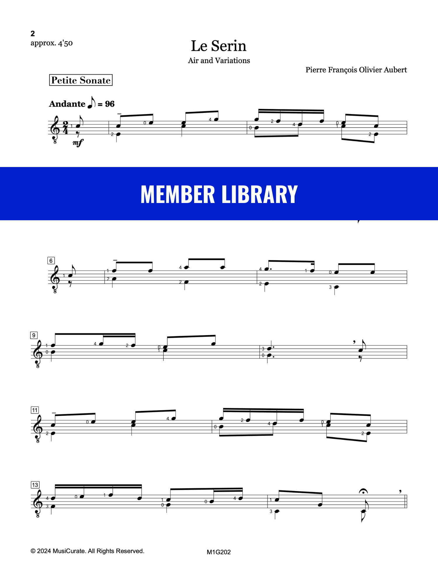 A serin is a small, finch-like songbird, closely related to the canary, found in Europe and North Africa, known for its bright yellow-green plumage and melodious song. This piece by Aubert is included in his New Method for the Five or Six String Guitar (Op. 18). The melodic theme and each subsequent variation are introduced as small airs in sonata form.