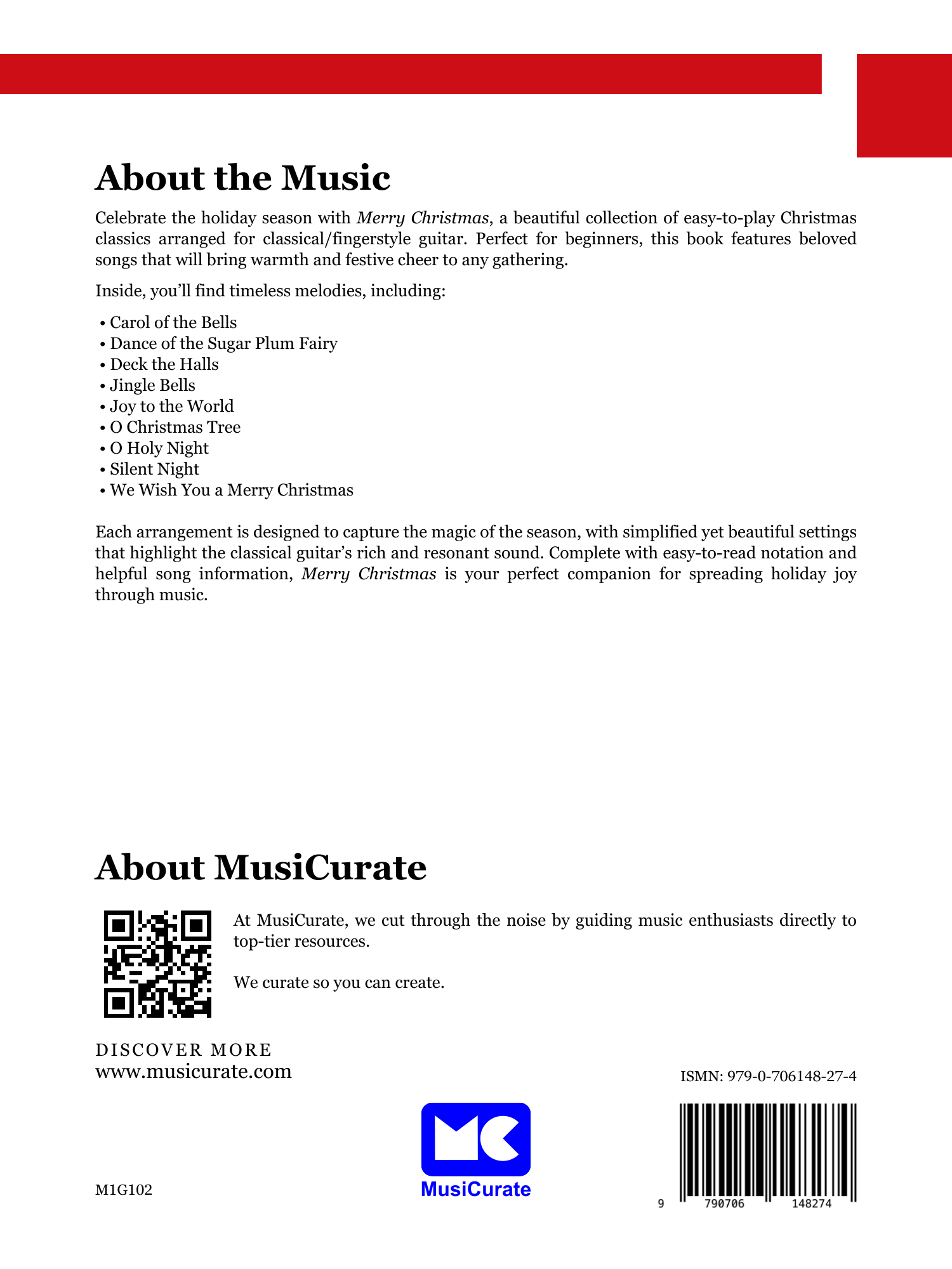 Each arrangement is designed to capture the magic of the season, with simplified yet beautiful settings that highlight the classical guitar’s rich and resonant sound. Complete with easy-to-read notation and helpful song information, Merry Christmas is your perfect companion for spreading holiday joy through music.