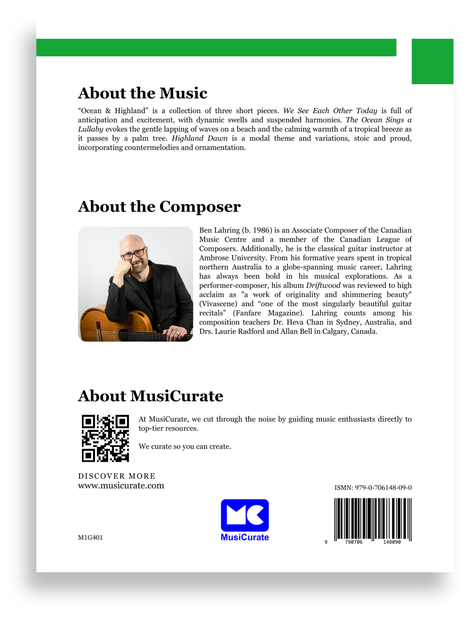 Ben Lahring (b. 1986) is an Associate Composer of the Canadian Music Centre and a member of the Canadian League of Composers. Additionally, he is the classical guitar instructor at Ambrose University. From his formative years spent in tropical northern Australia to a globe-spanning music career, Lahring has always been bold in his musical explorations. As a performer-composer, his album Driftwood was reviewed to high acclaim as "a work of originality and shimmering beauty" (Vivascene) and “one of the most singularly beautiful guitar recitals” (Fanfare Magazine). Lahring counts among his composition teachers Dr. Heva Chan in Sydney, Australia, and Drs. Laurie Radford and Allan Bell in Calgary, Canada.