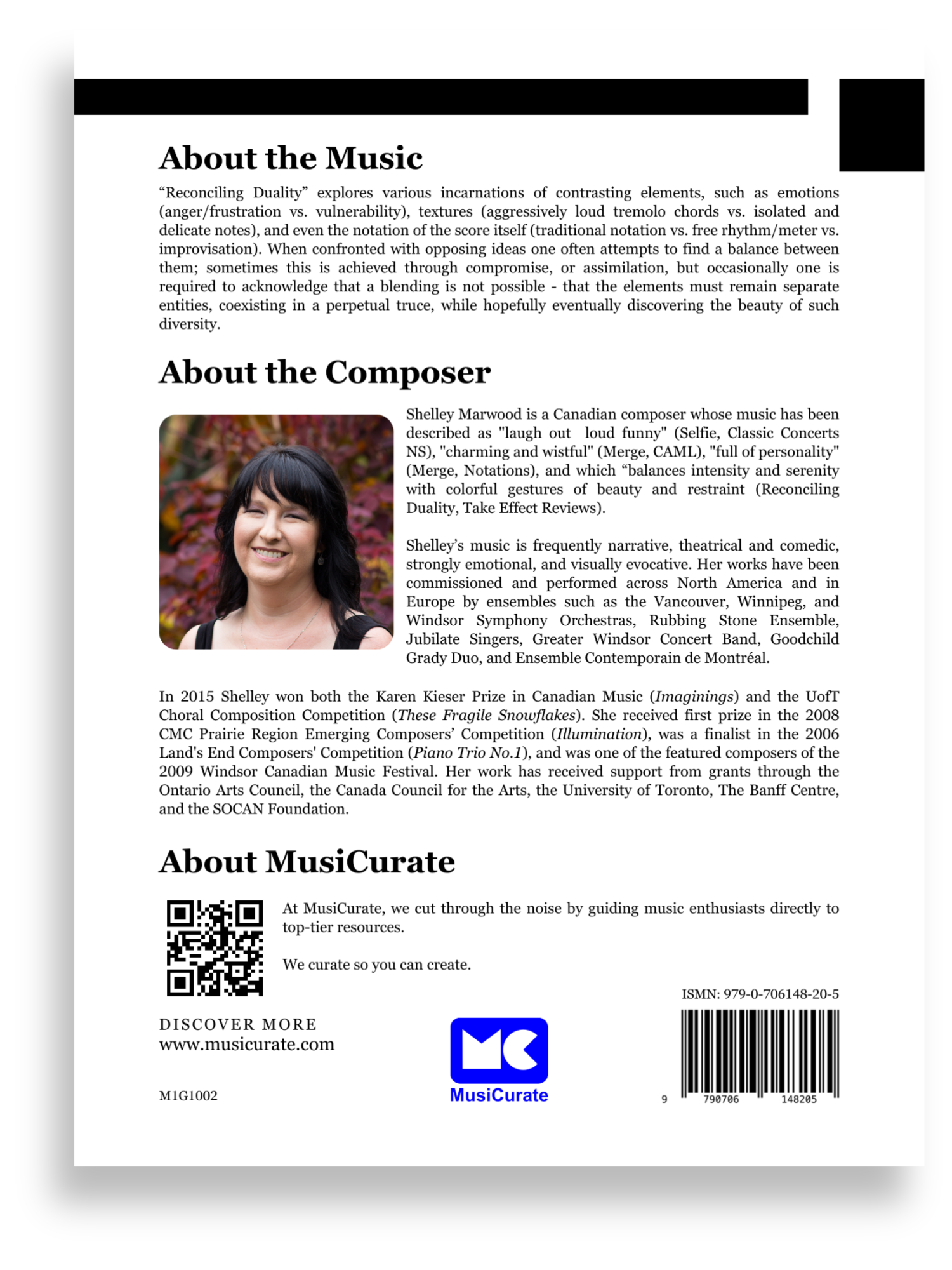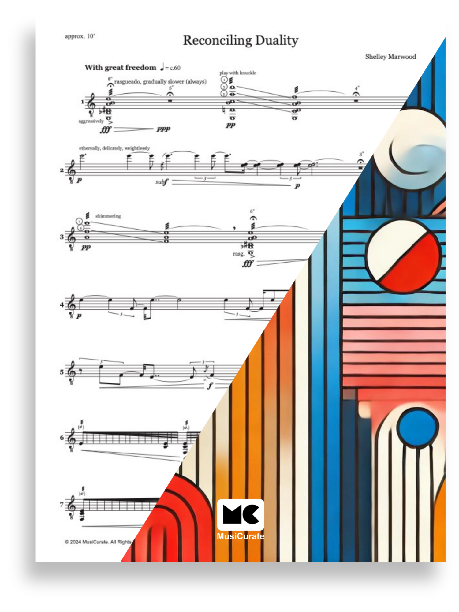 “Reconciling Duality” explores various incarnations of contrasting elements, such as emotions (anger/frustration vs. vulnerability), textures (aggressively loud tremolo chords vs. isolated and delicate notes), and even the notation of the score itself (traditional notation vs. free rhythm/meter vs. improvisation). When confronted with opposing ideas one often attempts to find a balance between them; sometimes this is achieved through compromise, or assimilation, but occasionally one is required to acknowledge that a blending is not possible - that the elements must remain separate entities, coexisting in a perpetual truce, while hopefully eventually discovering the beauty of such diversity.