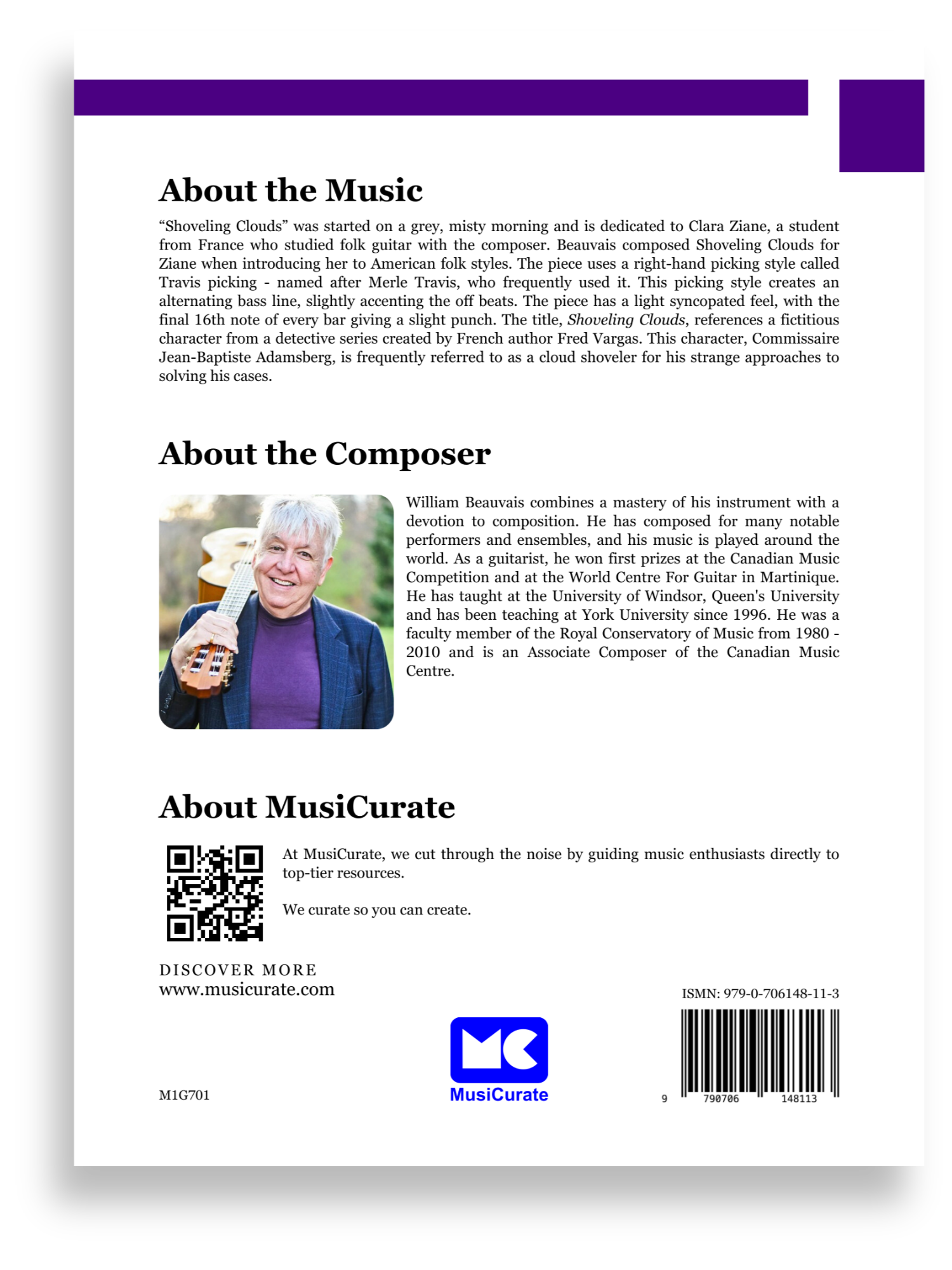 William Beauvais combines a mastery of his instrument with a devotion to composition. He has composed for many notable performers and ensembles, and his music is played around the world. As a guitarist, he won first prizes at the Canadian Music Competition and at the World Centre For Guitar in Martinique. He has taught at the University of Windsor, Queen's University and has been teaching at York University since 1996. He was a faculty member of the Royal Conservatory of Music from 1980 - 2010 and is an Associate Composer of the Canadian Music Centre.