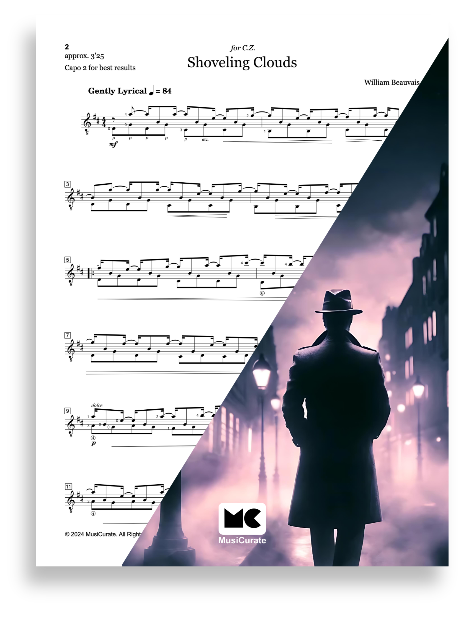 “Shoveling Clouds” was started on a grey, misty morning and is dedicated to Clara Ziane, a student from France who studied folk guitar with the composer. Beauvais composed Shoveling Clouds for Ziane when introducing her to American folk styles. The piece uses a right-hand picking style called Travis picking - named after Merle Travis, who frequently used it. This picking style creates an alternating bass line, slightly accenting the off beats. The piece has a light syncopated feel, with the final 16th note of every bar giving a slight punch. The title, Shoveling Clouds, references a fictitious character from a detective series created by French author Fred Vargas. This character, Commissaire Jean-Baptiste Adamsberg, is frequently referred to as a cloud shoveler for his strange approaches to solving his cases.