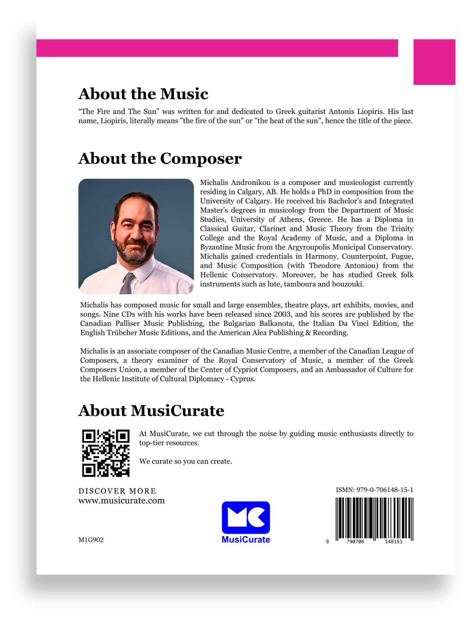 Michalis Andronikou is a composer and musicologist currently residing in Calgary, AB. He holds a PhD in composition from the University of Calgary. He received his Bachelor’s and Integrated Master’s degrees in musicology from the Department of Music Studies, University of Athens, Greece. He has a Diploma in Classical Guitar, Clarinet and Music Theory from the Trinity College and the Royal Academy of Music, and a Diploma in Byzantine Music from the Argyroupolis Municipal Conservatory. Michalis gained credentials in Harmony, Counterpoint, Fugue, and Music Composition (with Theodore Antoniou) from the Hellenic Conservatory. Moreover, he has studied Greek folk instruments such as lute, tamboura and bouzouki.