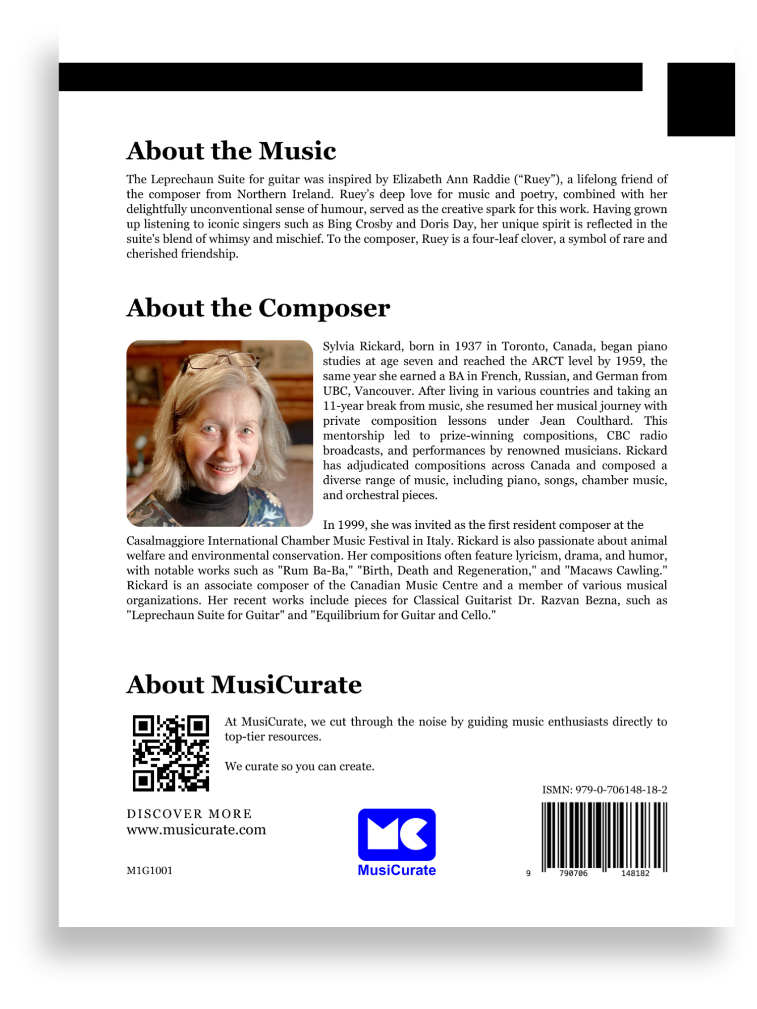 The Leprechaun Suite for guitar was inspired by Elizabeth Ann Raddie (“Ruey”), a lifelong friend of the composer from Northern Ireland. Ruey’s deep love for music and poetry, combined with her delightfully unconventional sense of humour, served as the creative spark for this work. Having grown up listening to iconic singers such as Bing Crosby and Doris Day, her unique spirit is reflected in the suite's blend of whimsy and mischief. To the composer, Ruey is a four-leaf clover, a symbol of rare and cherished friendship.