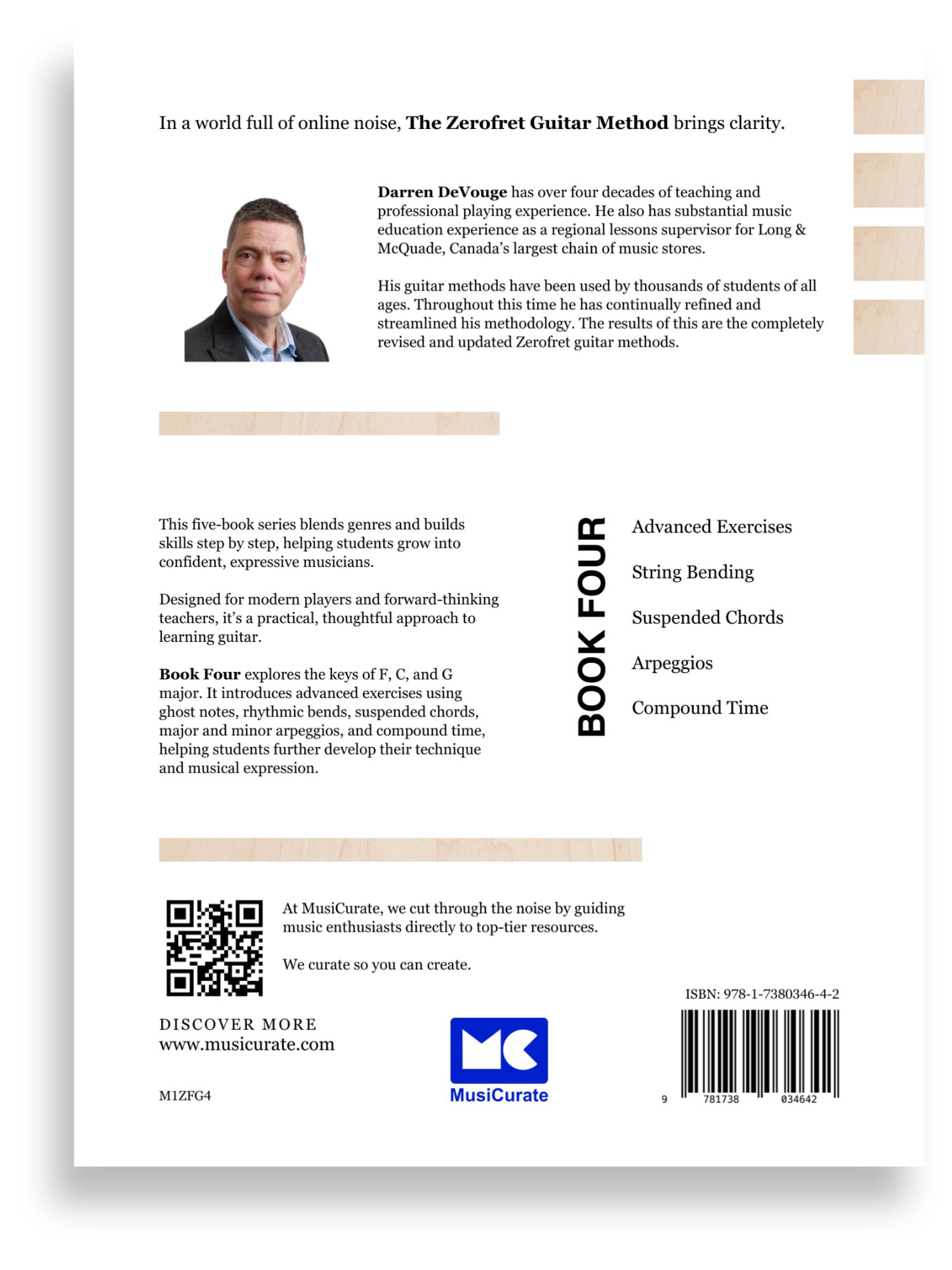 Book Four builds on second-position reading, exploring the keys of F, C, and G major. It introduces advanced power chord exercises, ghost notes, rhythmic bends, suspended chords, major and minor arpeggios, and compound time, helping students further develop their technique and musical expression.