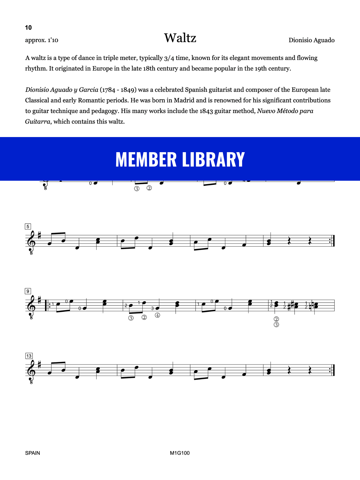 Dionisio Aguado y Garcia (1784 - 1849) was a celebrated Spanish guitarist and composer of the European late Classical and early Romantic periods. He was born in Madrid and is renowned for his significant contributions to guitar technique and pedagogy. His many works include the 1843 guitar method, Nuevo Método para Guitarra, which contains this waltz.
